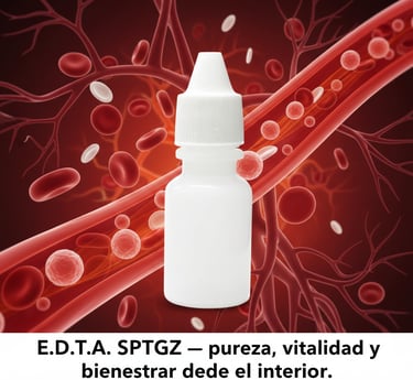 El E.D.T.A. (Ácido Etilendiaminotetraacético) es un agente quelante natural que ayuda al cuerpo a eliminar metales pesados y toxinas del torrente sanguíneo.